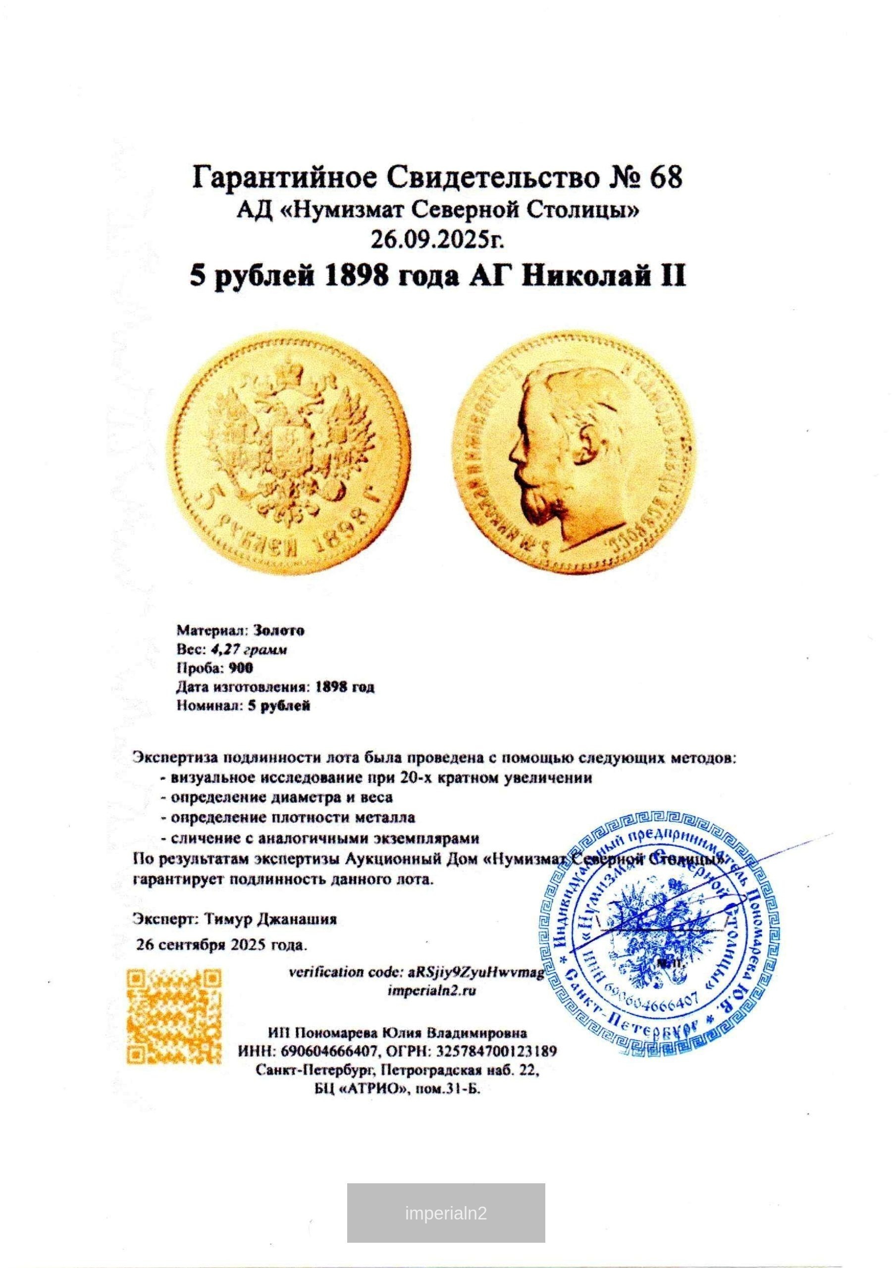 Сертификат «5 рублей 1898 года АГ Николай II»
