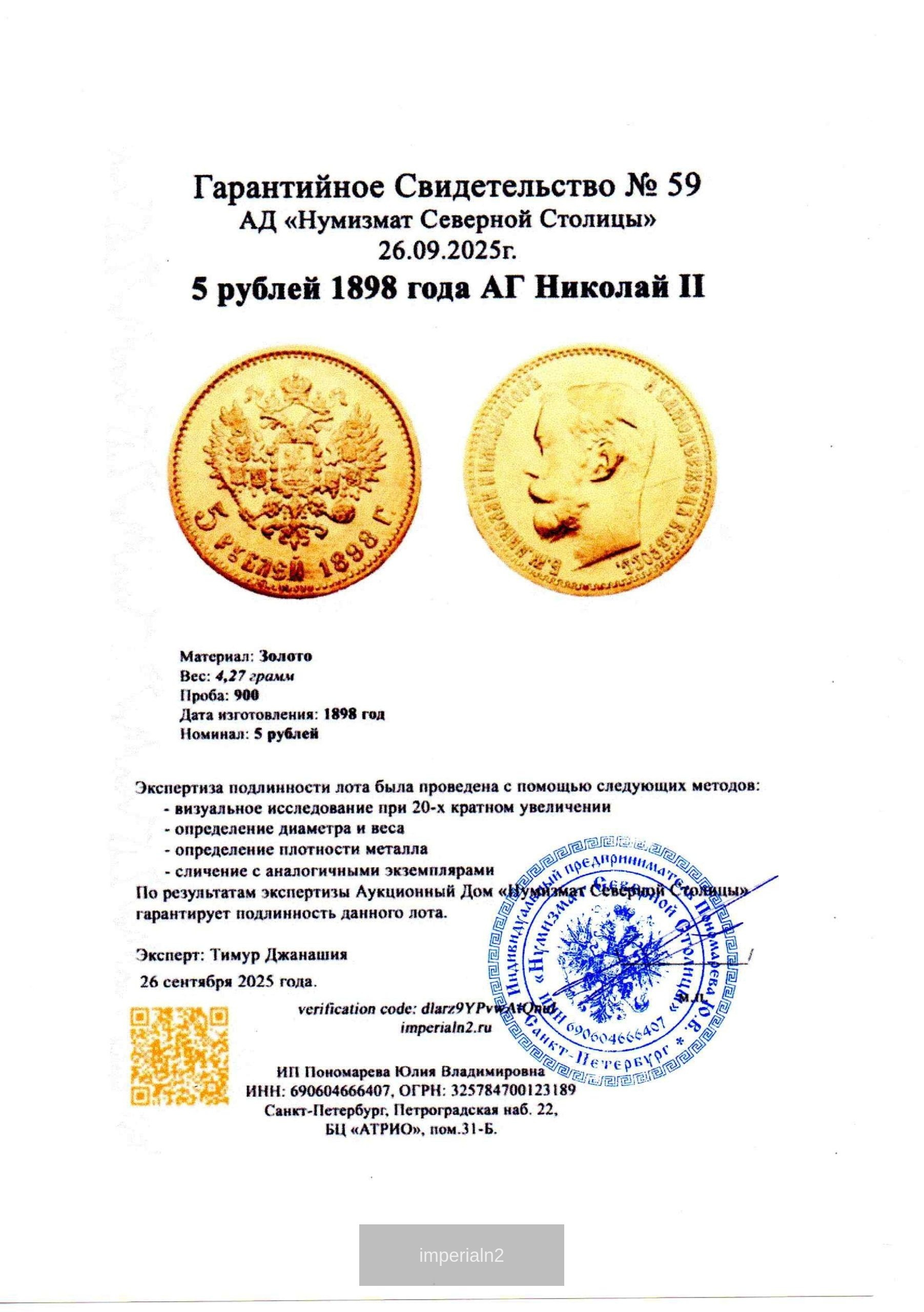 Место проведения экспертизы: Россия, г. Санкт-Петербург, ул. Восстания д.1, «Нумизмат Северной Столицы»