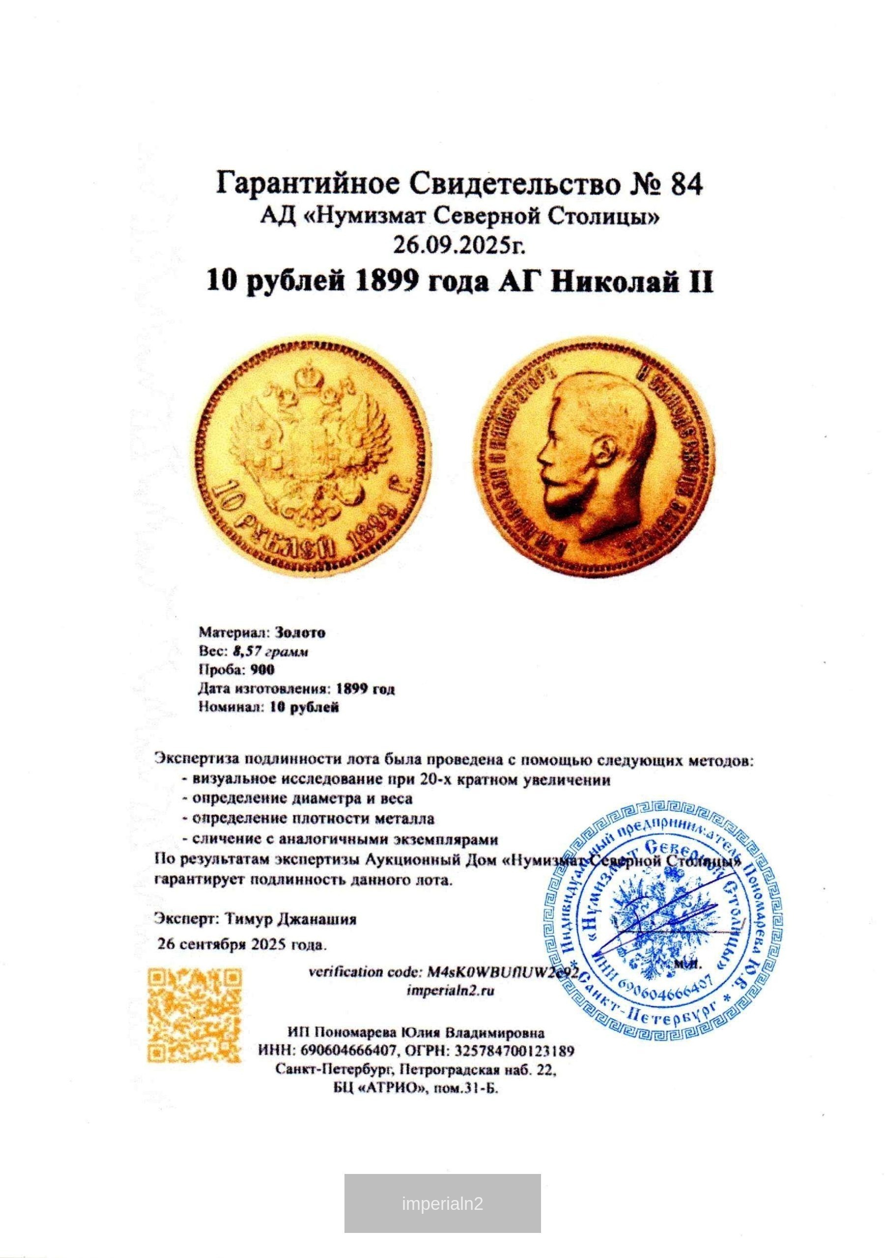 Сертификат «10 рублей 1899 года АГ Николай II»
