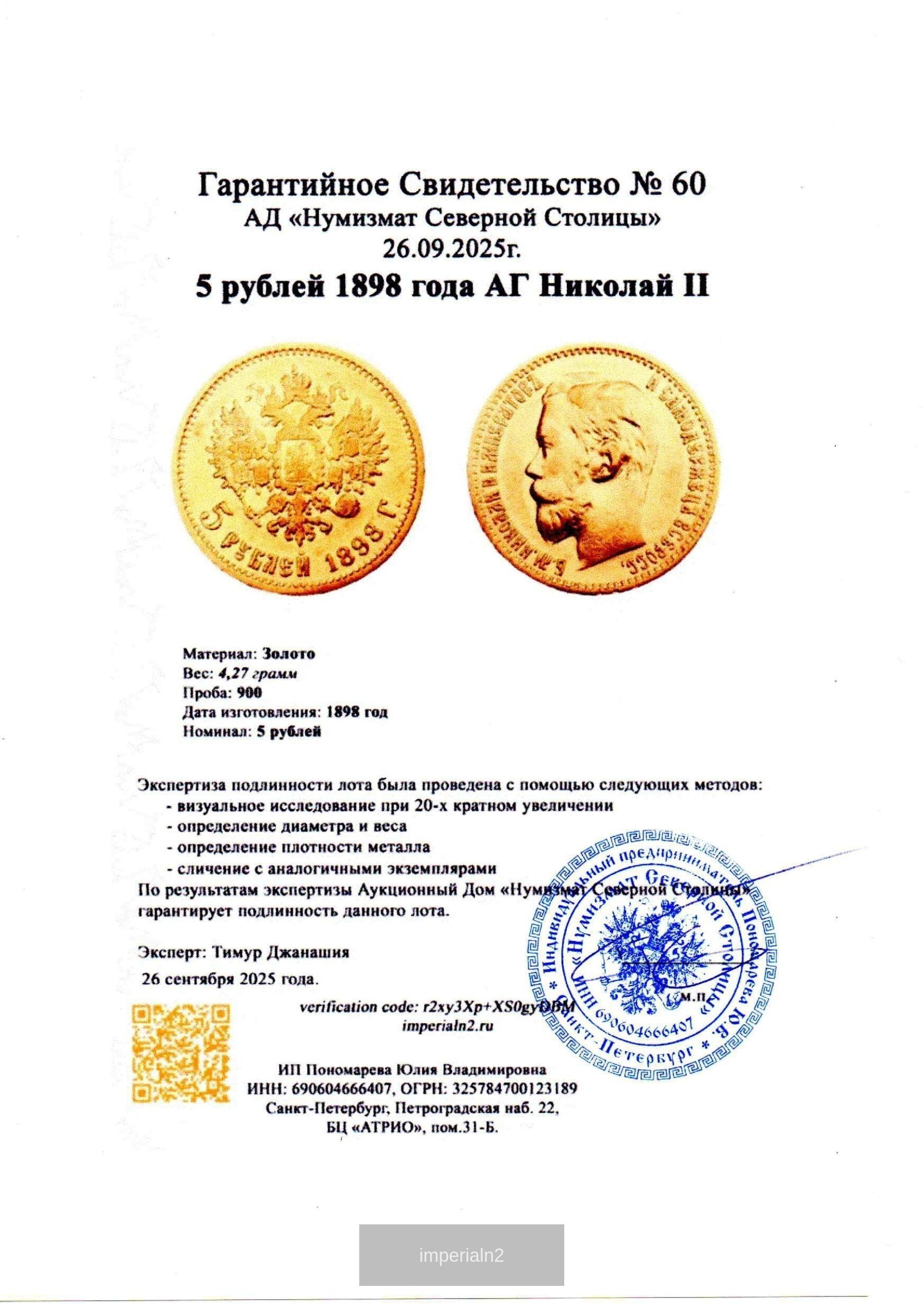 Сертификат «5 рублей 1898 года АГ Николай II»
