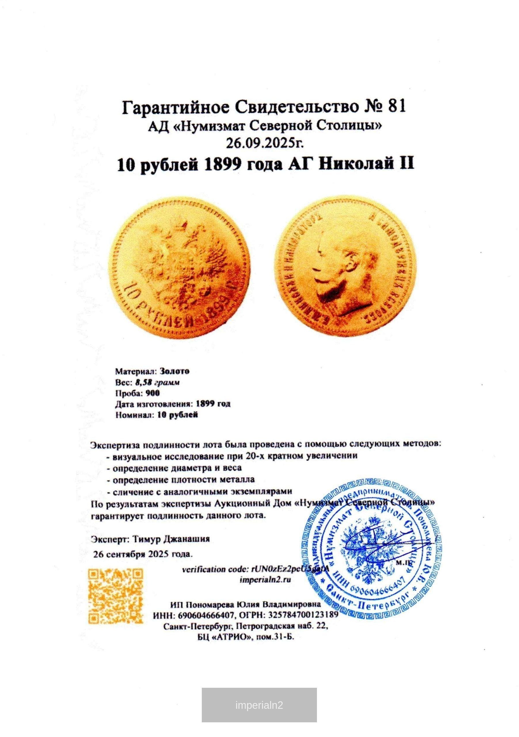 Сертификат «10 рублей 1899 года АГ Николай II»