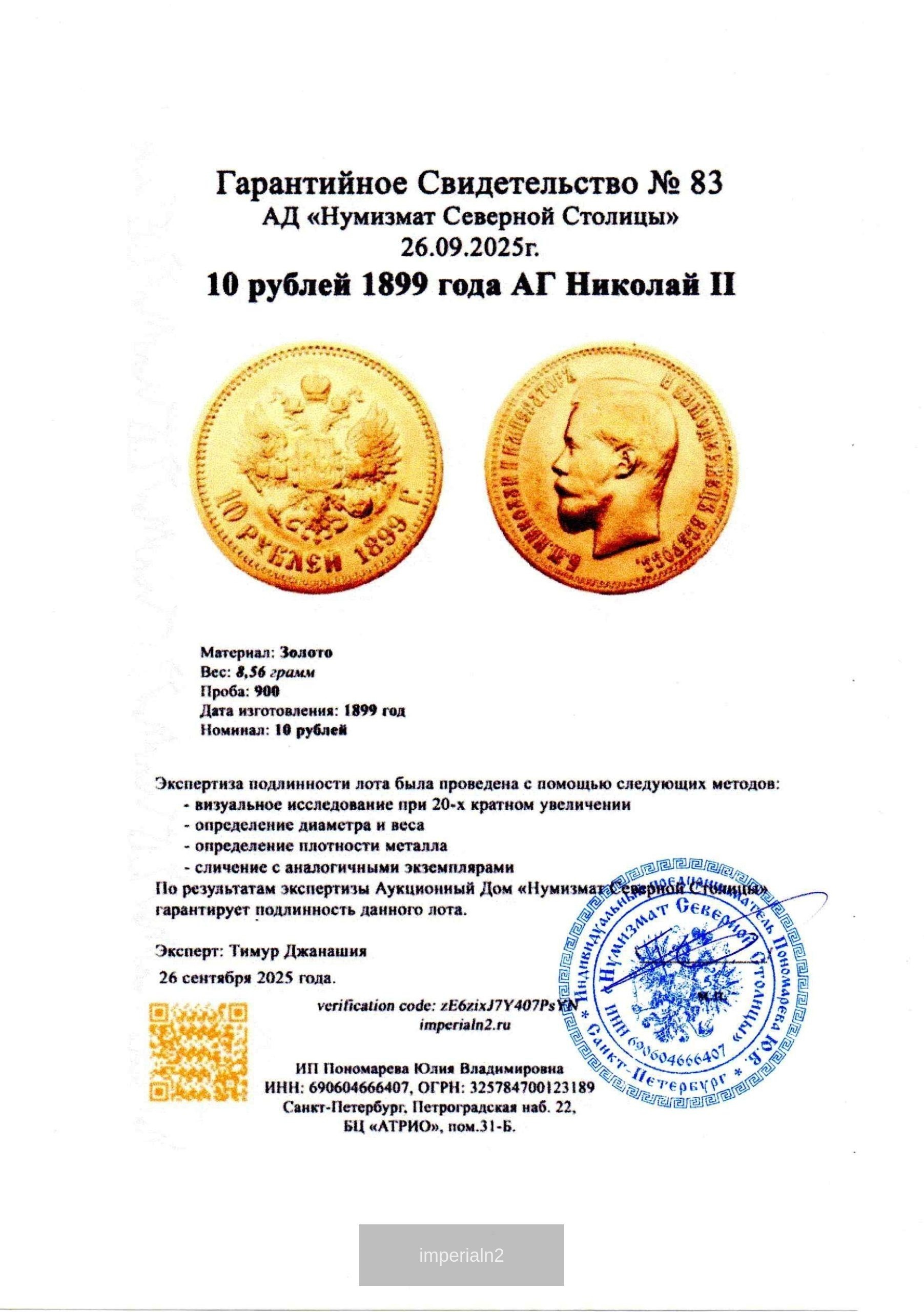 Сертификат «10 рублей 1899 года АГ Николай II»